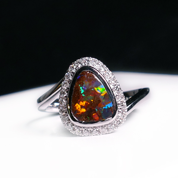 Queensland Boulder Opal Engagement Ring in White Gold with a Rub-Over Setting and Diamond HaloNow that you've read all about boulder opals we hope that you find them as great a choice for an engagement ring as we do. If you'd like to see more examples of compelling Queensland boulder opal rings visit us in person or at our online shop.