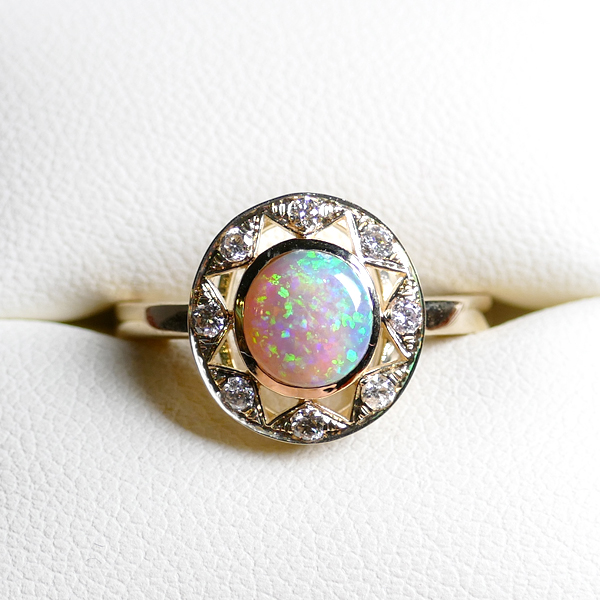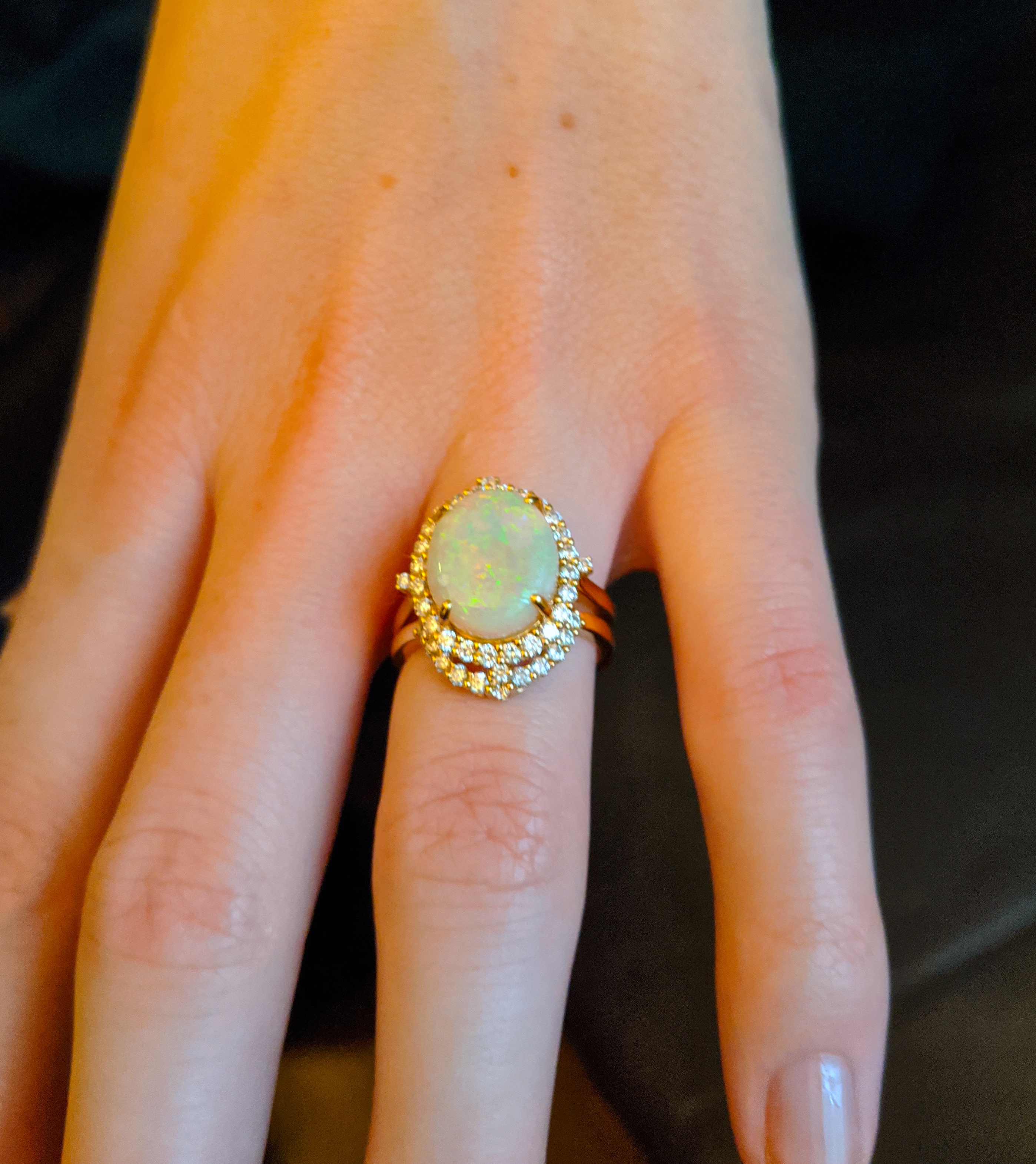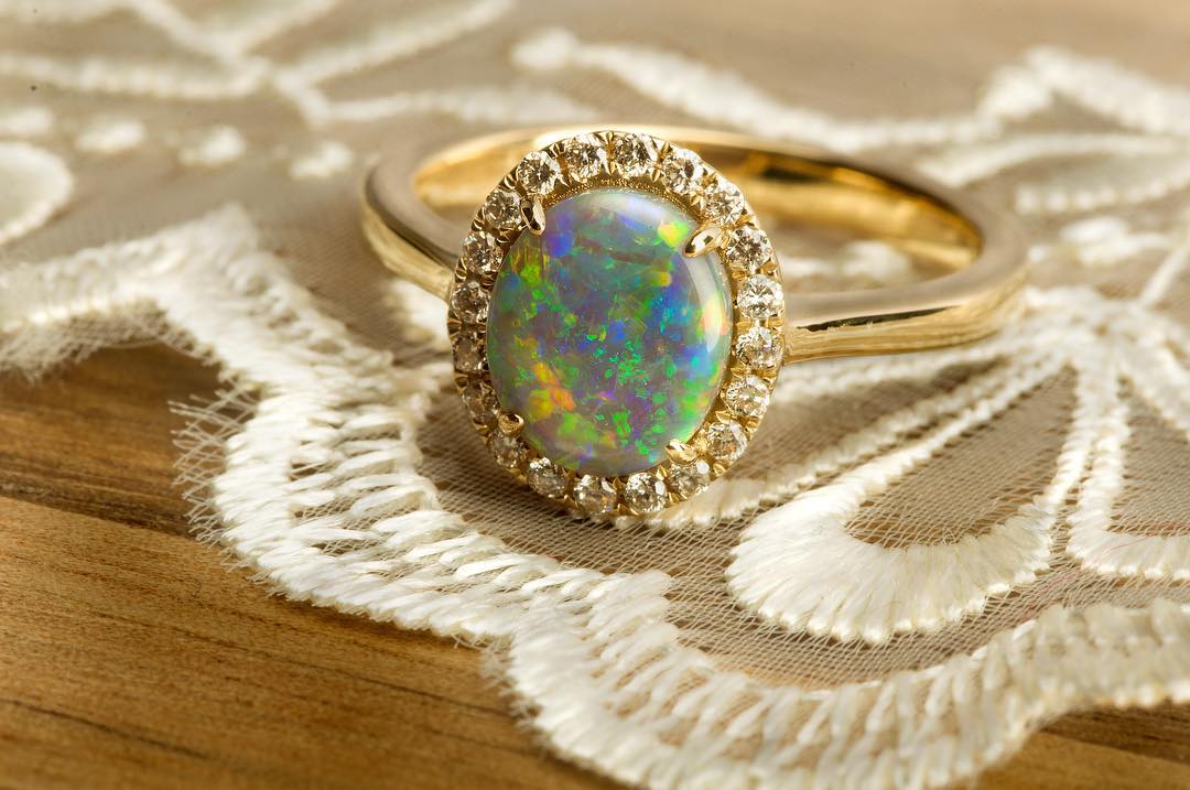 Australian Opal Engagement Ring in 14k Yellow Gold with DiamondsDiamonds make a spectacular addition to a yellow gold setting, in a halo (surrounding the stone), or on the band. I like to think of an engagement ring setting as a frame. There are regular frames, and then there are filigree frames like the ones around the paintings in the Louvre. These frames enhance not only the artwork but its sense of importance. They're complimentary but not over the top. Having diamonds alongside an Australian opal adds that extra little bit of flair.